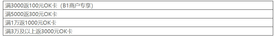 【尊享禮三】折后再享滿5000返300元OK卡、滿1萬(wàn)返1000元OK卡,滿3萬(wàn)及以上返3000元OK卡
